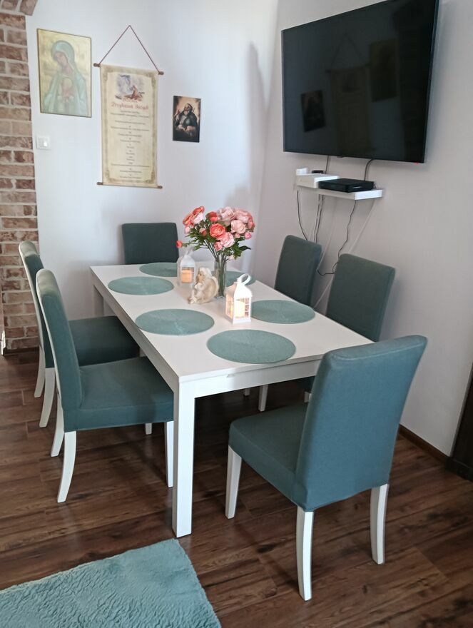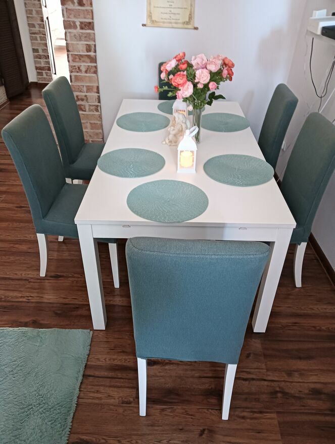 Rozkładany stół z 6 krzesłami w kolorze miętowym. Meble są w dobrym stanie, nadają się do użytku w kuchni lub jadalni. Praktyczne rozwiązanie, które pozwala na wygodne przyjmowanie gości. Lekko używane w stanie bardzo dobrym.Wymiary stołu w spoczynku : dł. 175cmx szer. 95cm x wys. 74cm a po rozłożeniu dł. 230cm.