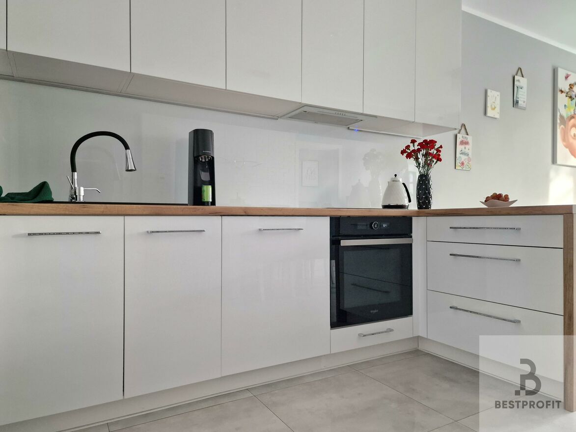 Biała zabudowa meblowa oraz wysokiej jakości sprzęt AGD czynią kuchnię elegancką i praktyczną. Duże okna wpuszczają mnóstwo naturalnego światła, tworząc przyjemną atmosferę.