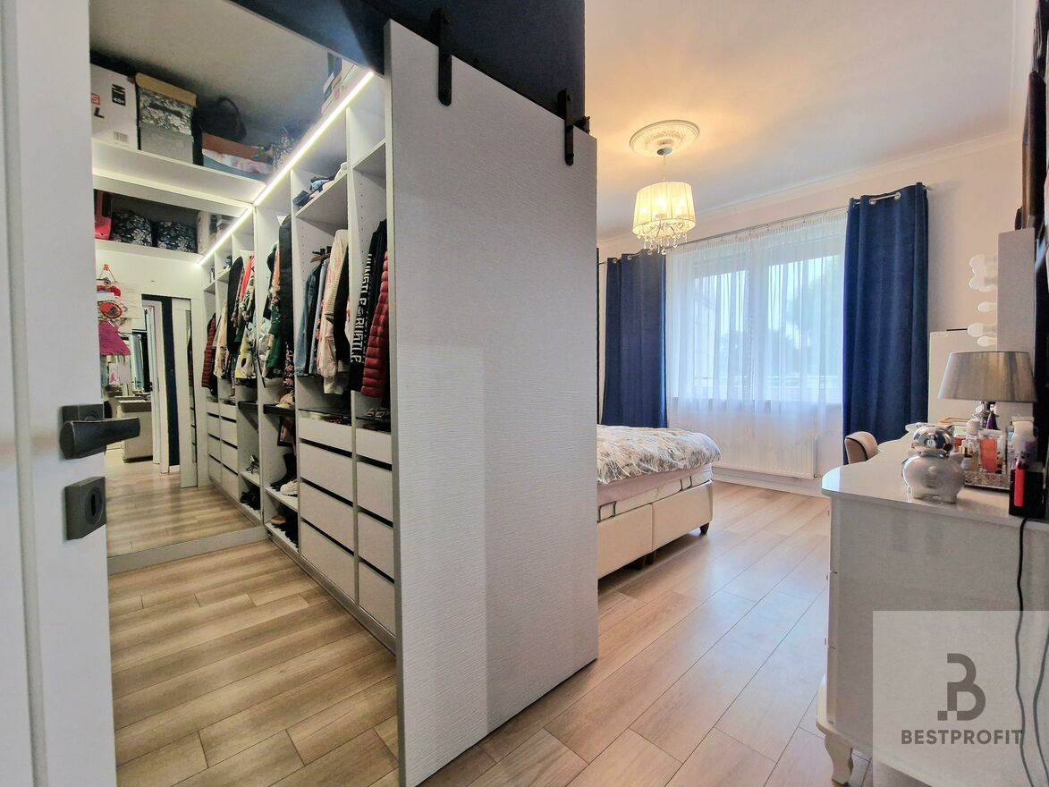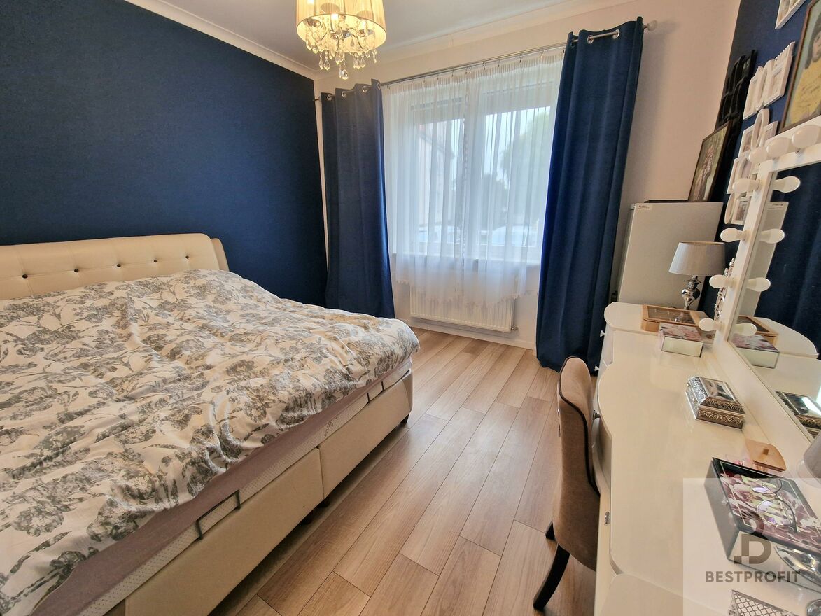Przestronny, otwarty i bardzo jasny salon z widokiem na ogródki działkowe, 2 pokoje dla dzieci i oddzielna sypialnia z własną garderobą.