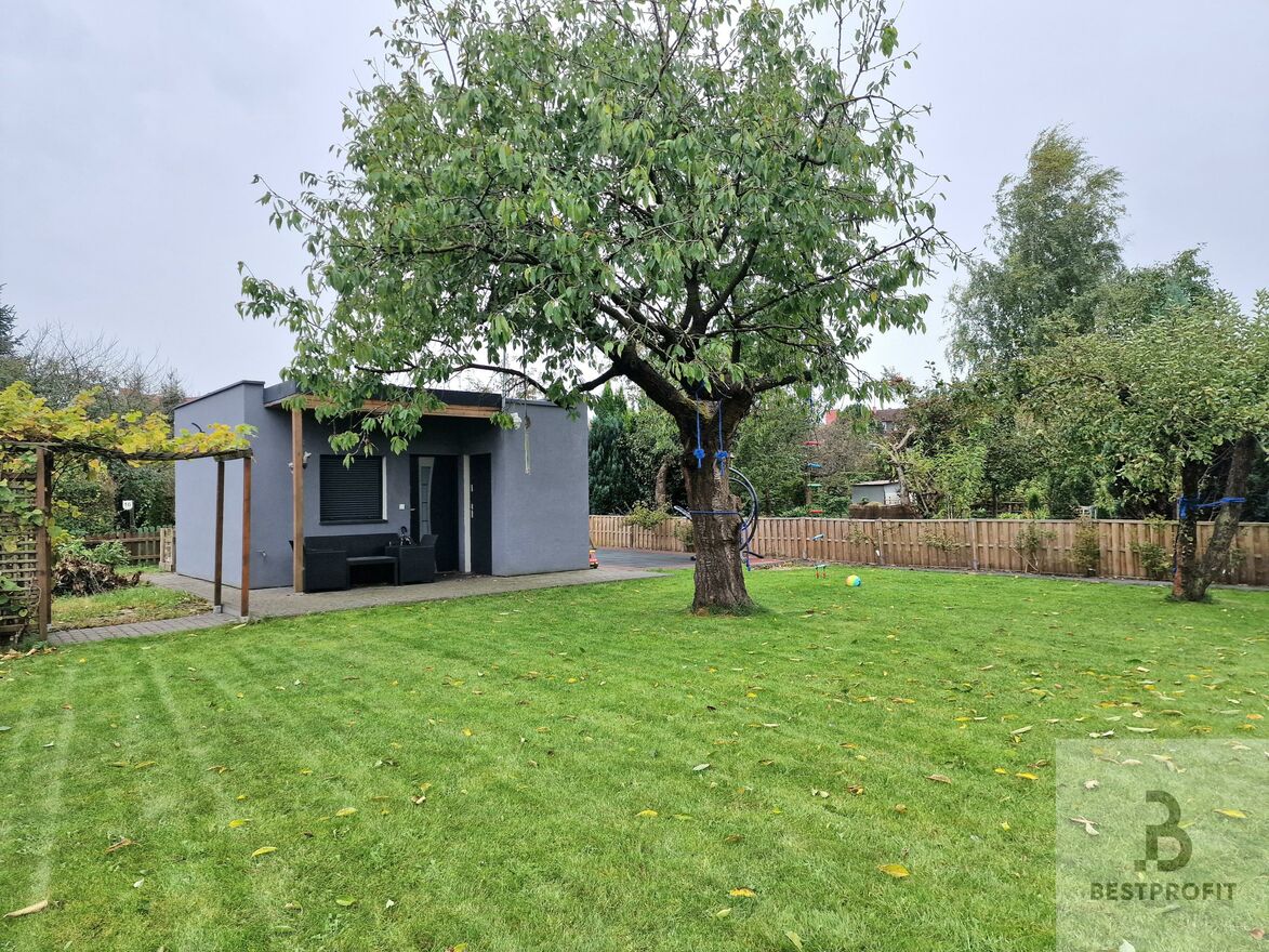 Jest tam altana, oraz murowany domek gospodarczy i plac zabaw z nawierzchnią z tartanu. W budynku pokój z aneksem kuchennym oraz łazienka, a na zewnątrz instalacja alarmowa i kamery.