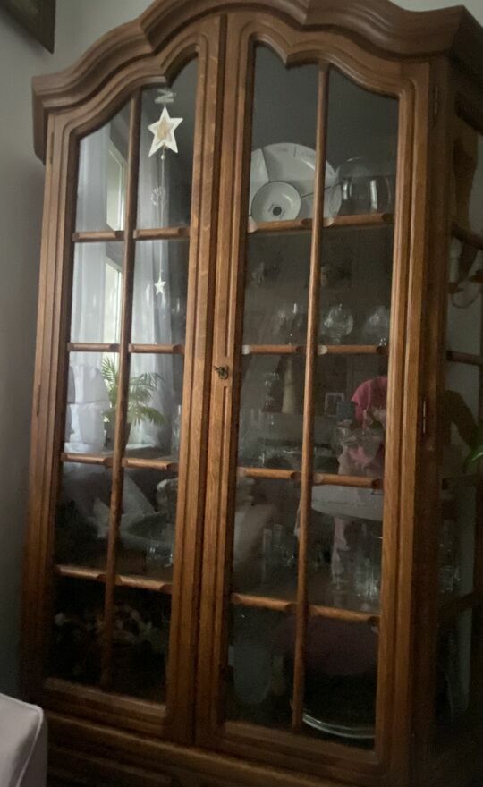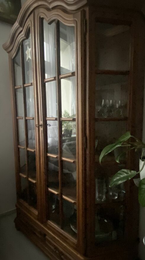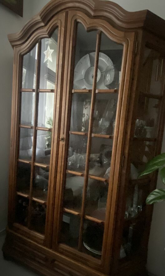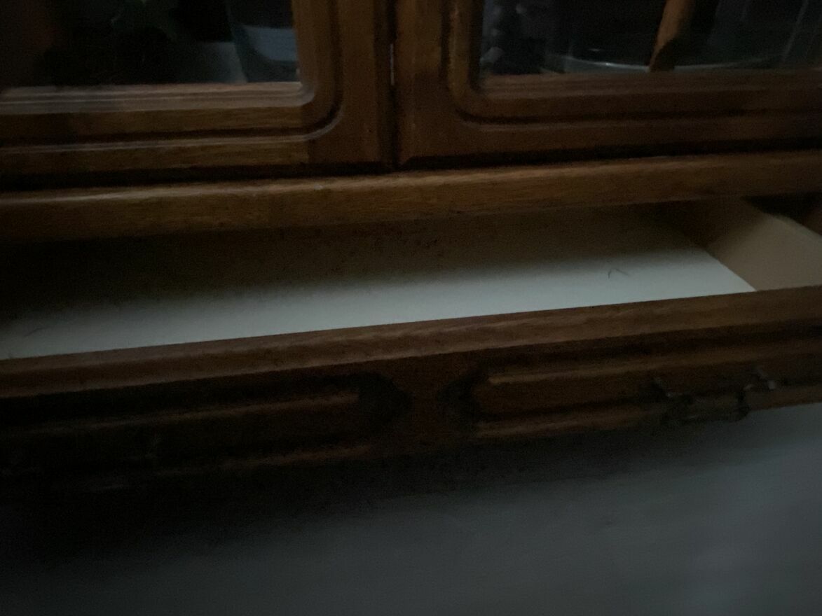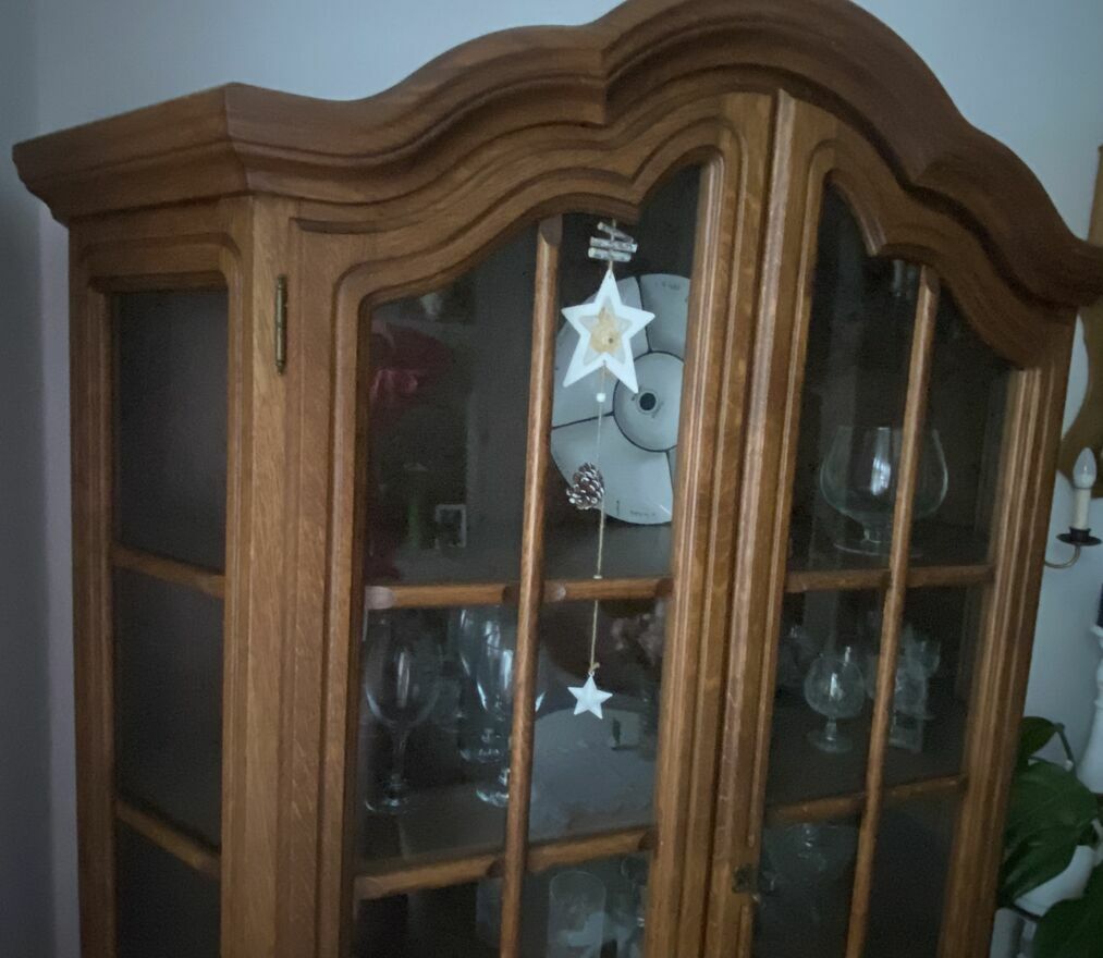Mebel jest w bardzo dobrym stanie. Z drewna dębowego. Ozdobiony dekoracyjnymi rzeźbieniami. Oszklona witryna sprawdzi się jako biblioteczka, ale również może posłużyć komuś jako barek. Zamykany na klucz. Piękny, antyczny mebel z duszą. W środku cztery, dębowe szerokie półki.Dolna część mebla posiada pojemną i szeroką szufladę z dwoma metalowymi uchwytami.